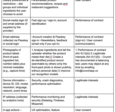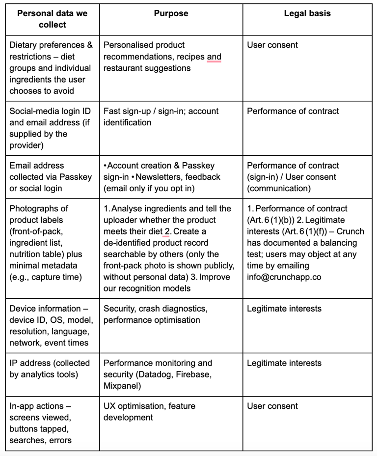 Crunch automatically compares product ingredients against your dietary selections to determine suitability. No additional sensitive data is used. You may request human review, express your viewpoint and contest any automated decision (GDPR Art. 22).