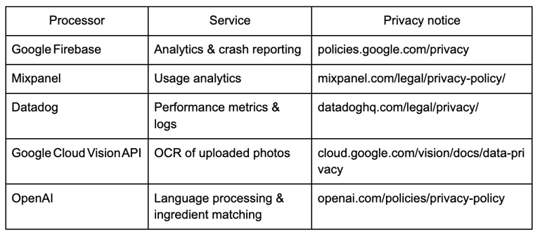 OpenAI GPT models – language processing & ingredient matching (EU or US regions, protected by Standard Contractual Clauses)